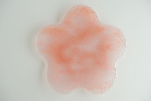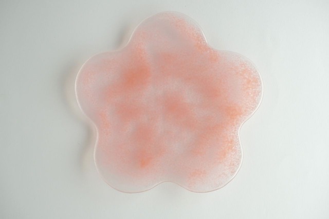 ふんわり立ち上がりのある、つややかな花の形のガラス皿です。 厚すぎず、薄すぎず、普段使いにちょうど良い軽やかさです。(ガラスの厚みは3mm) ガラスの色粉をふりかけて焼き付けることで、色のムラが出て雰囲気のある仕上がりになりました。 表面に0.5mm以下の極細かな黒点が見られます。 また、0.5mm以下の極細かな凹みが見られます。 size/約 H 1.2 W 13 D 13(cm) material/ガラス attention/光の透過等の影響で、作品の色味や色の濃さなど、写真と実物では見え方が若干異なる場合があります。予めご了承ください。 硬いものを載せる場合は、皿の表面に傷がつく可能性があります。ご注意ください。 裏面はなめらかですが、型の跡がついている場合があります。いずれもご使用には問題がなく、技法の特性として捉えております。予め、ご了承ください。 耐熱ガラスではありません。熱いものをのせたり、電子レンジや食洗器の使用は避けてください。 制作について/ 板ガラスにガラスの粉を焼き付けたものを、もう一度別の型に載せてお皿の形に曲げる、キルンワーク技法を用いています。