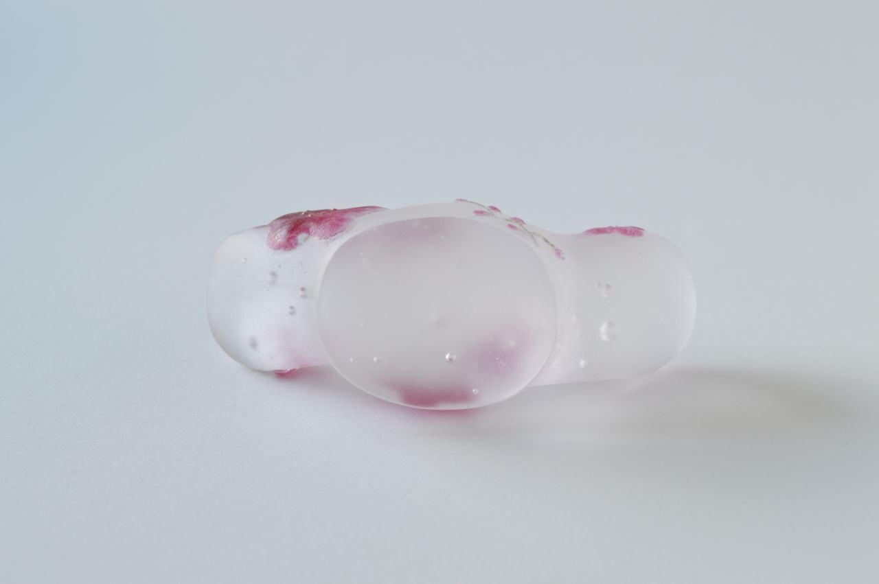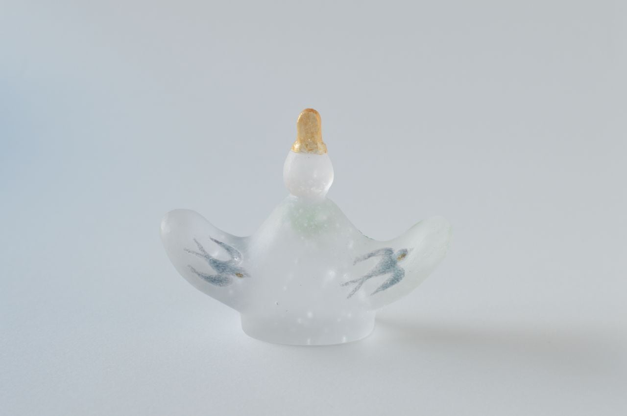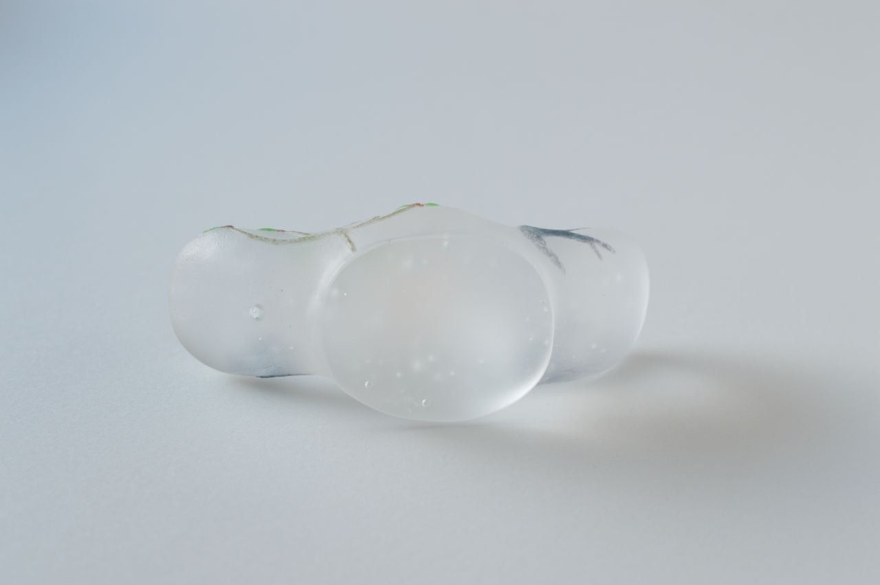 原型を作り、それを耐火石膏で型取り、中に砕いたガラスを詰めて、電気炉で焼成することでガラスを溶かして造形する、キルンキャストという技法を用いています。