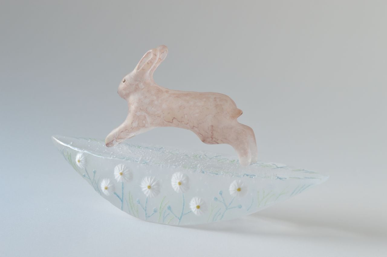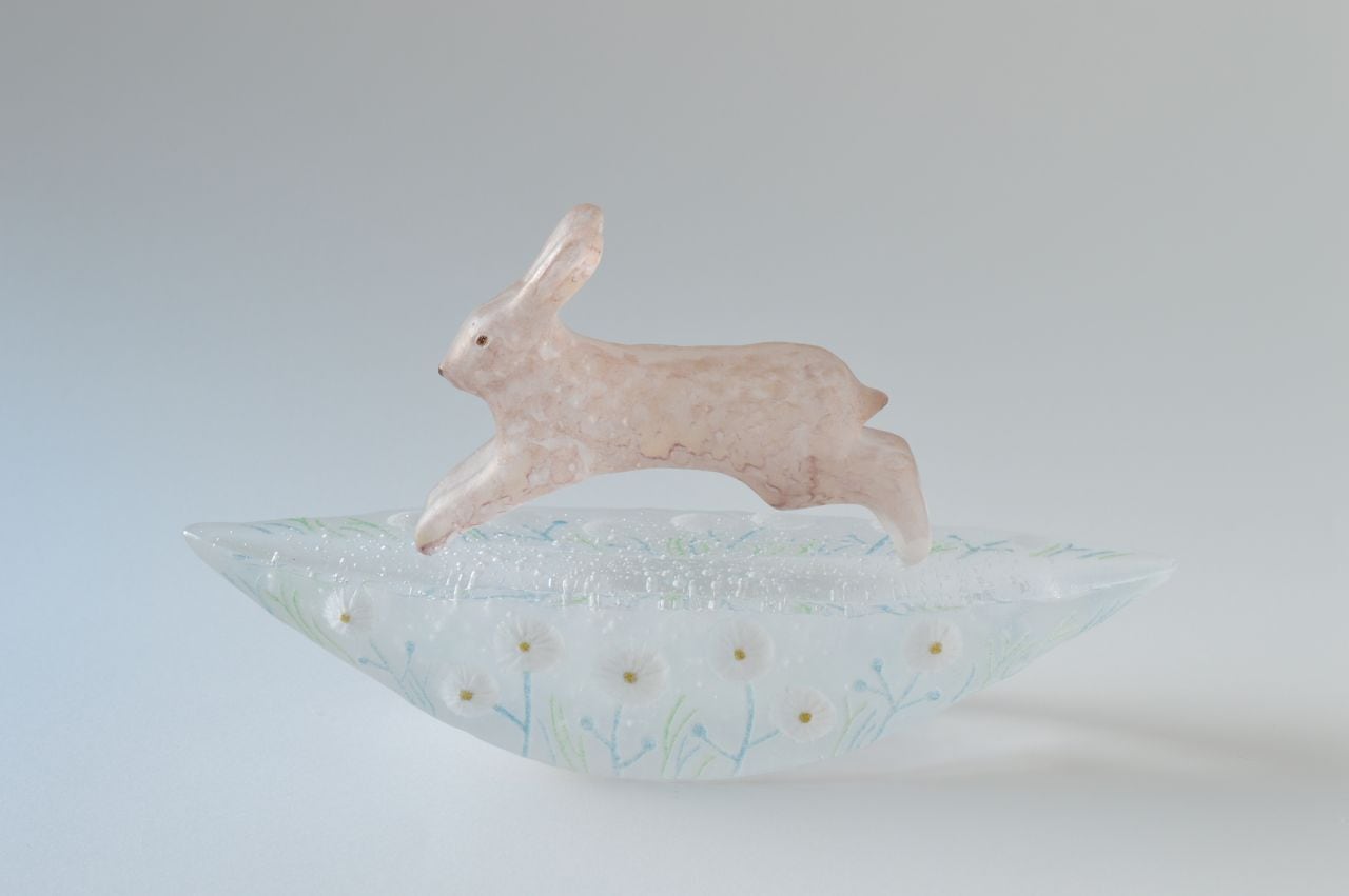 花の模様は耐火石膏型を彫り、色ガラスの粉を詰めることで、立体感のあるレリーフになっています。