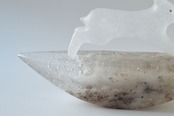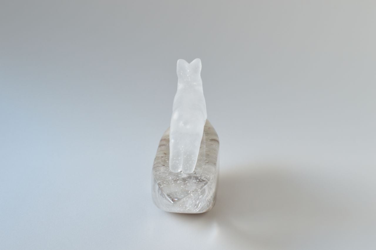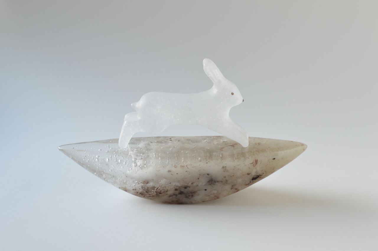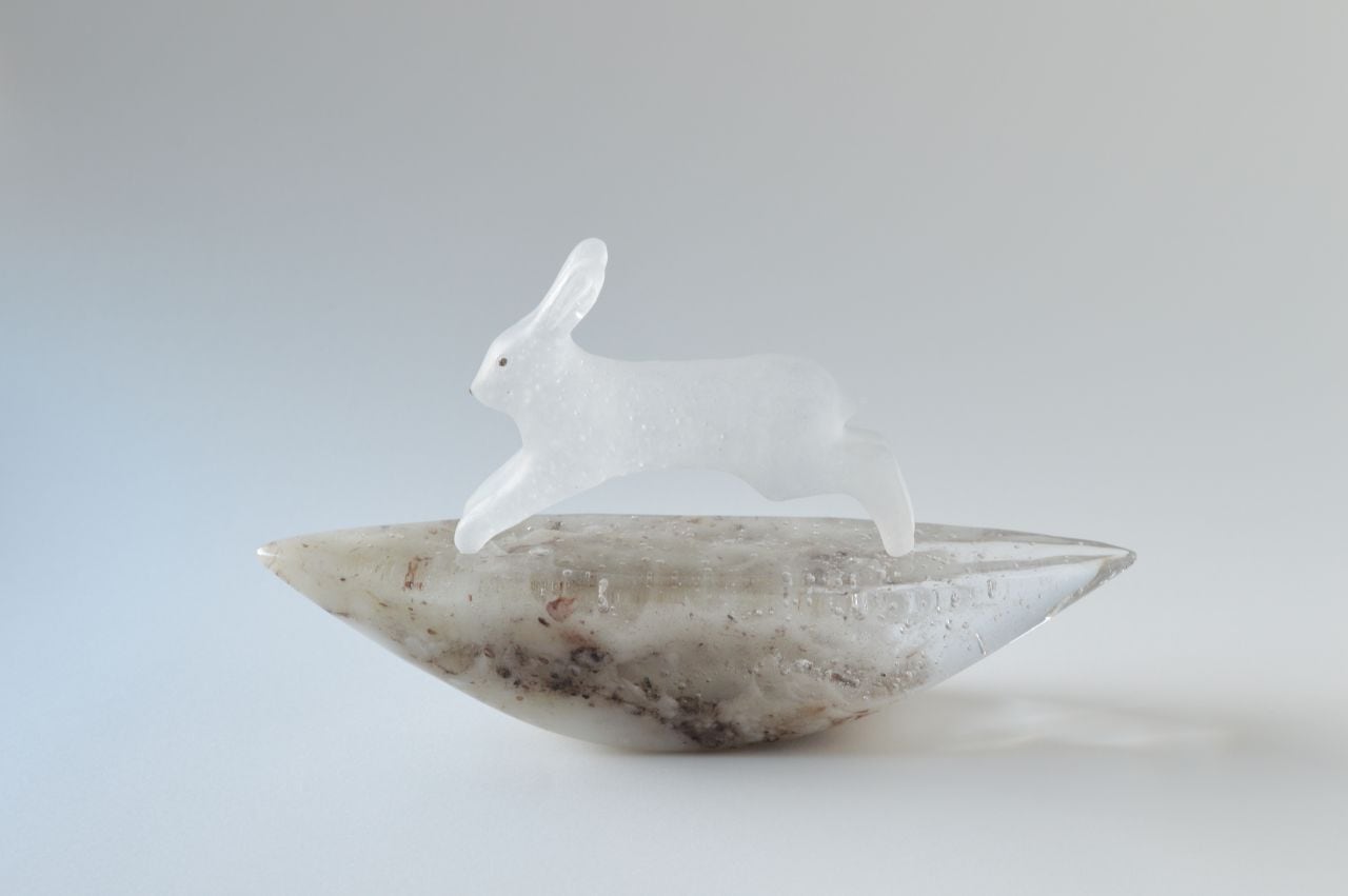 原型を作り、それを耐火石膏で型取り、中に砕いたガラスを詰めて、電気炉で焼成することでガラスを溶かして造形する、キルンキャストという技法を用いています。