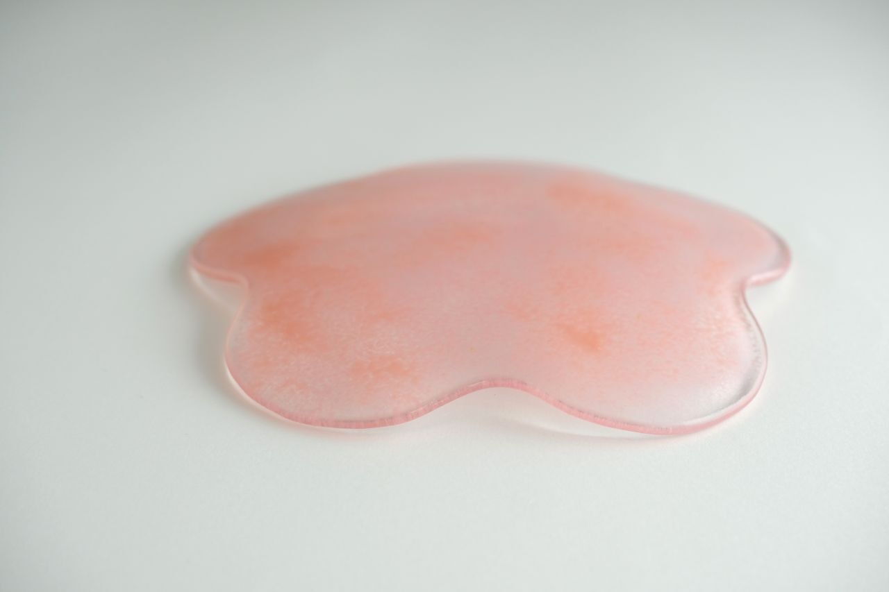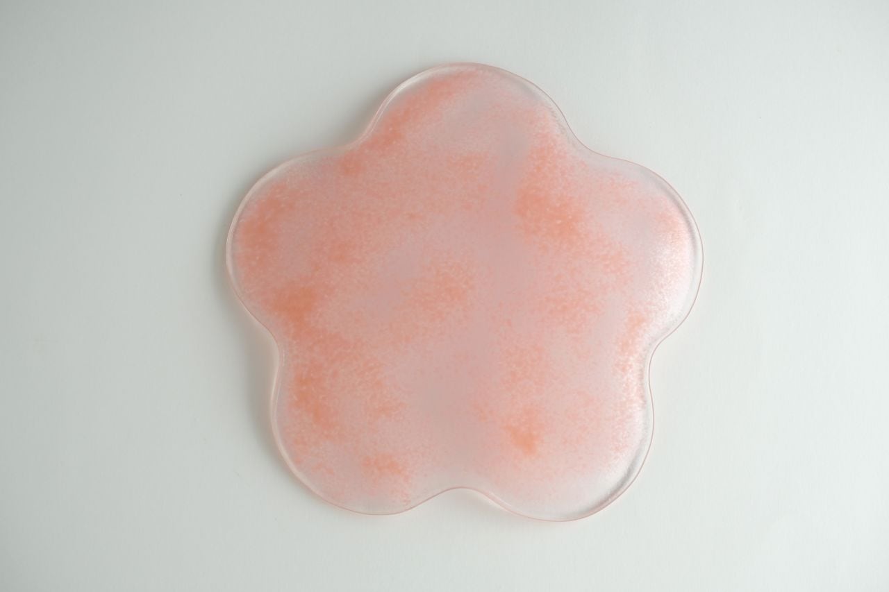 板ガラスにガラスの粉を焼き付けたものを、もう一度別の型に載せてお皿の形に曲げる、キルンワーク技法を用いています。