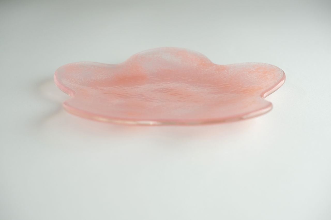 ふんわり立ち上がりのある、つややかな花の形のガラス皿です。