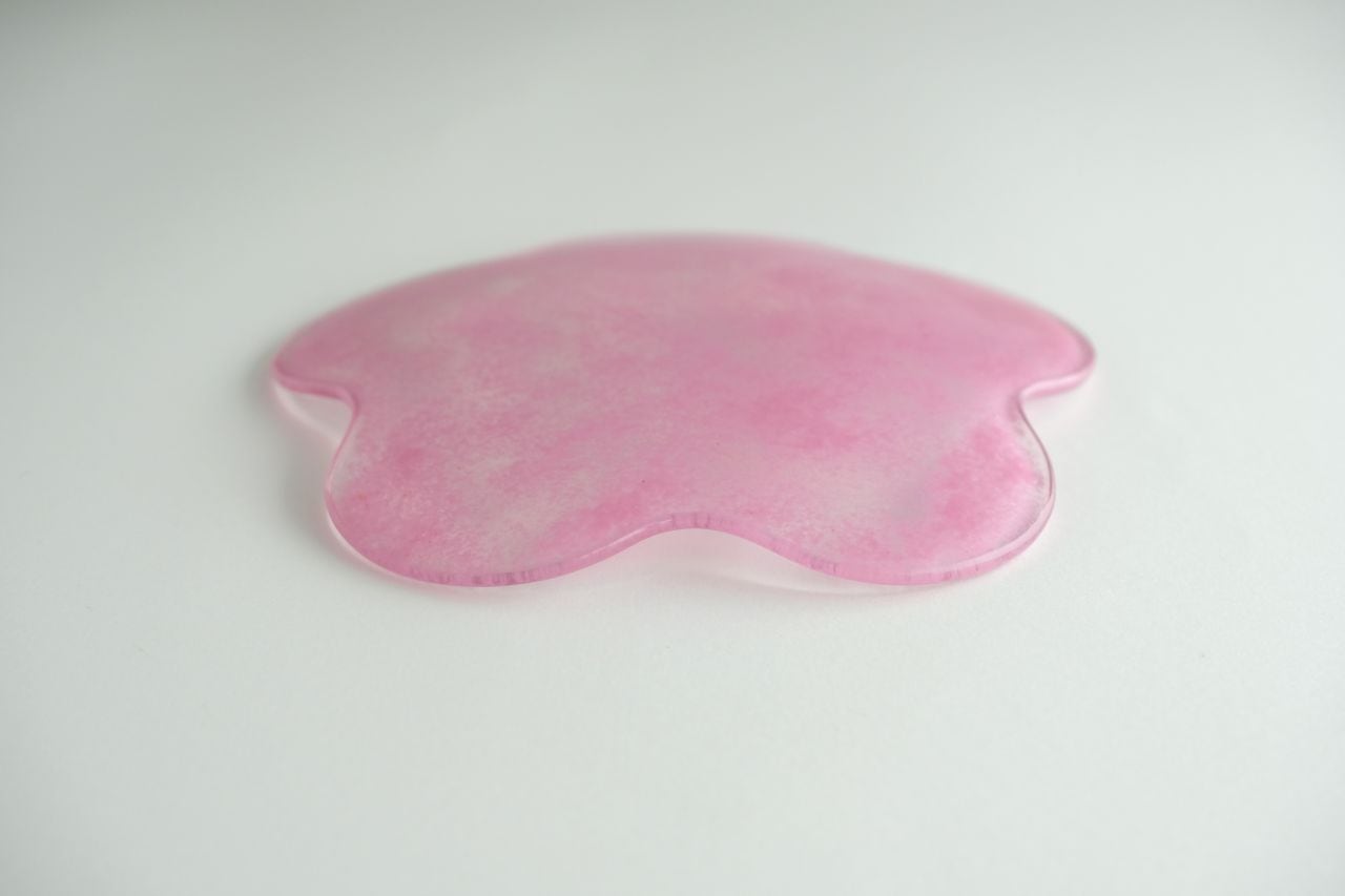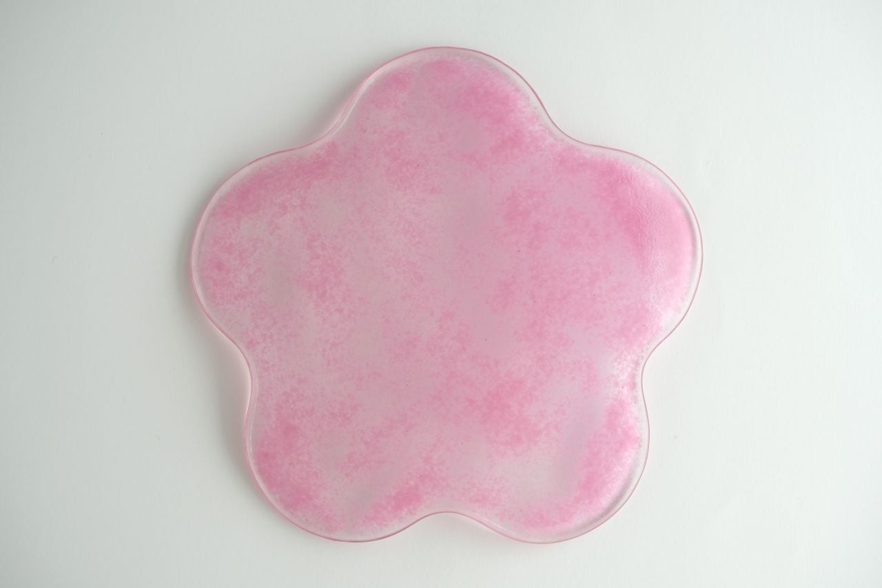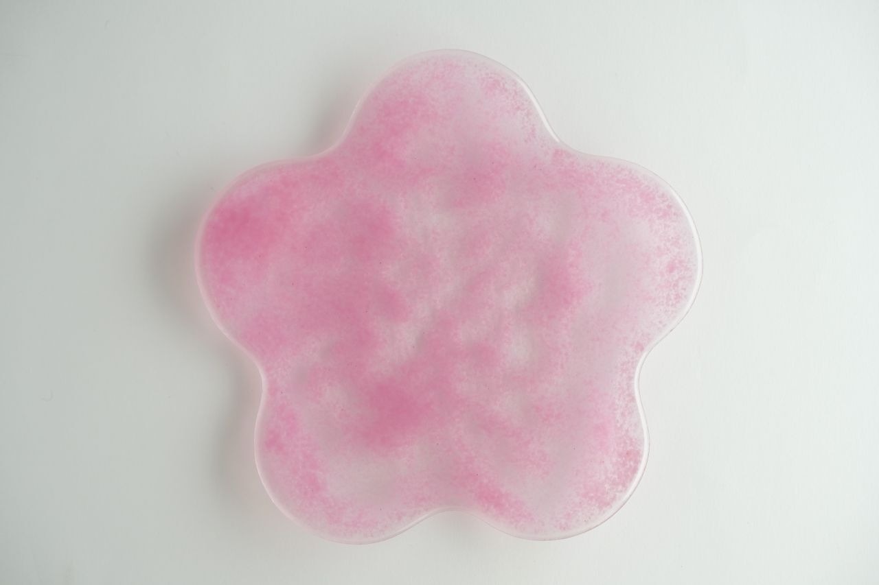 板ガラスにガラスの粉を焼き付けたものを、もう一度別の型に載せてお皿の形に曲げる、キルンワーク技法を用いています。