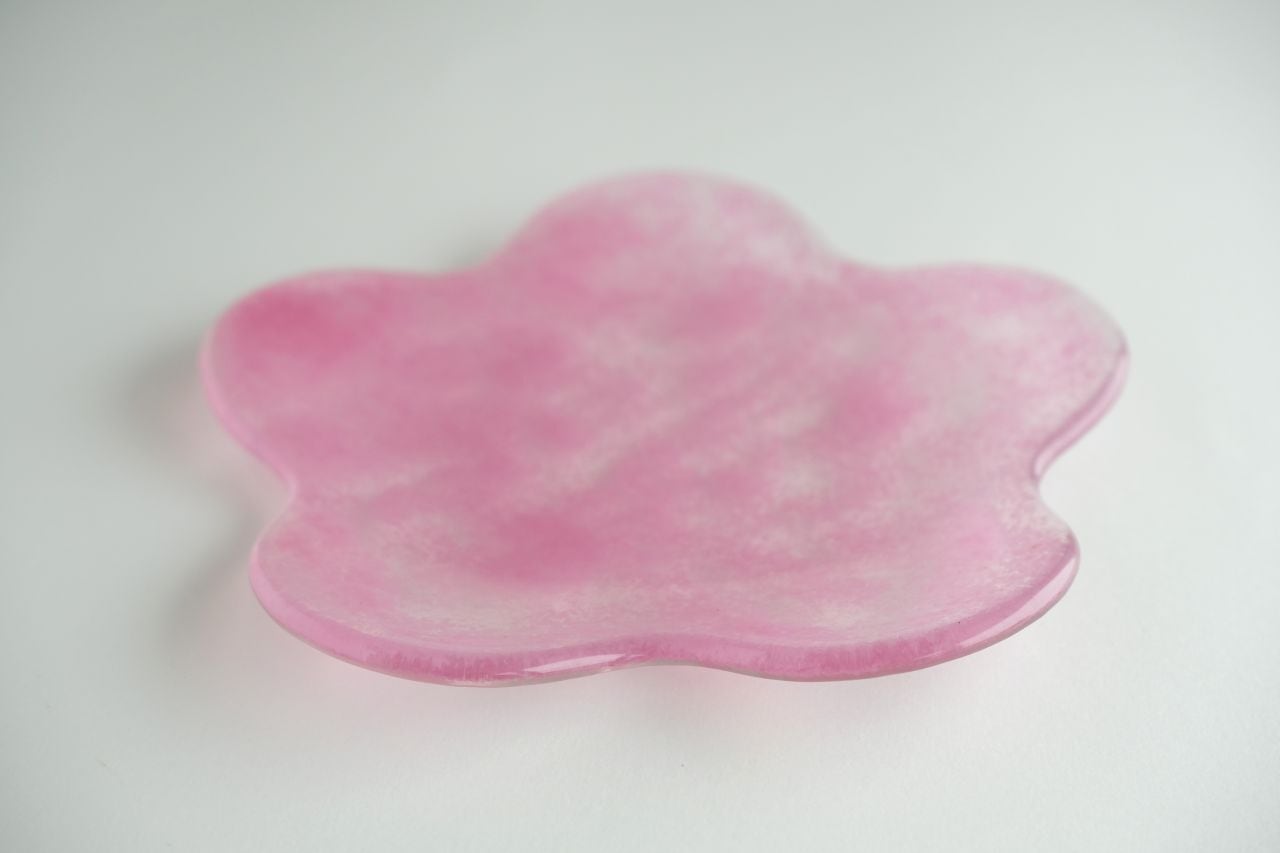 ふんわり立ち上がりのある、つややかな花の形のガラス皿です。