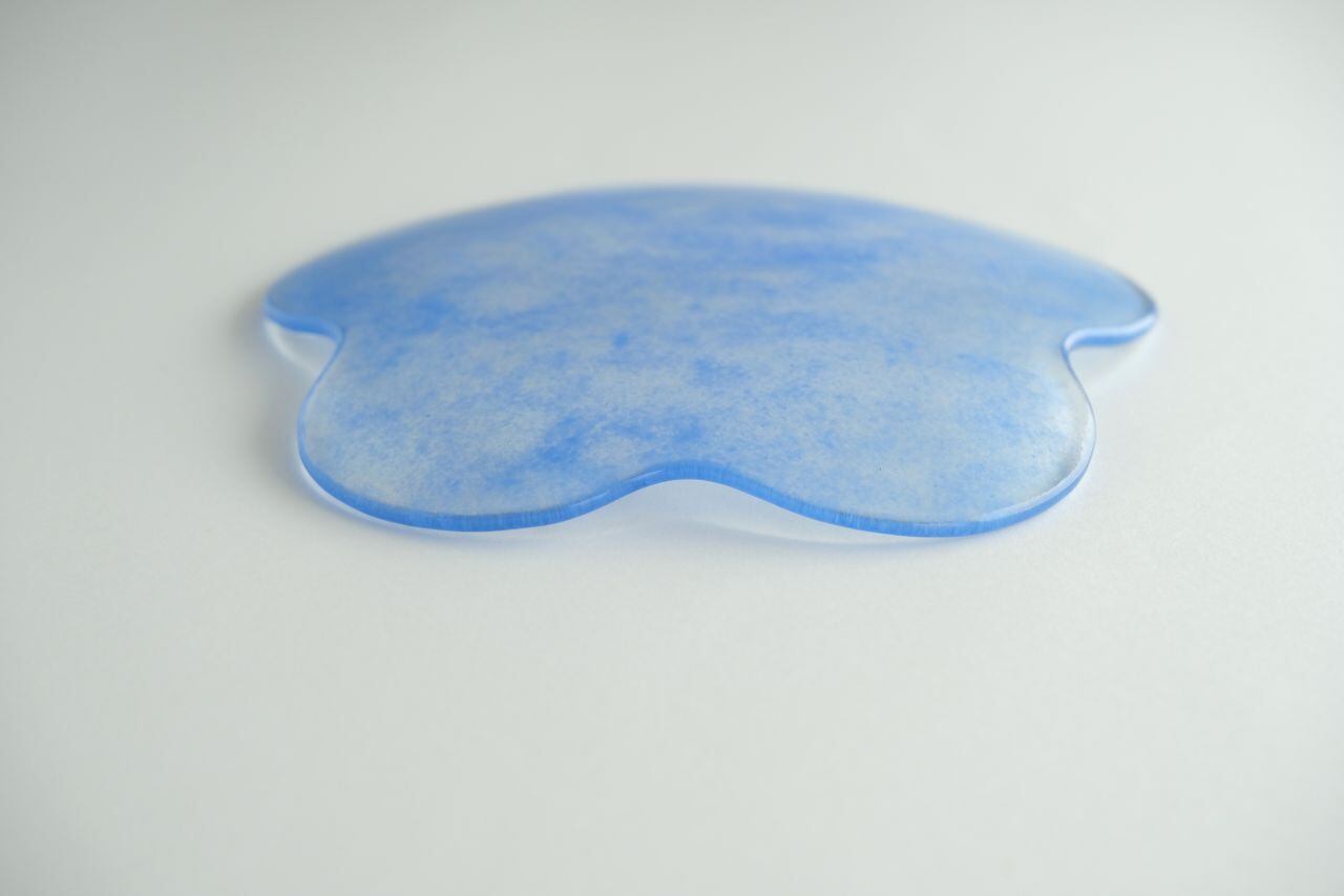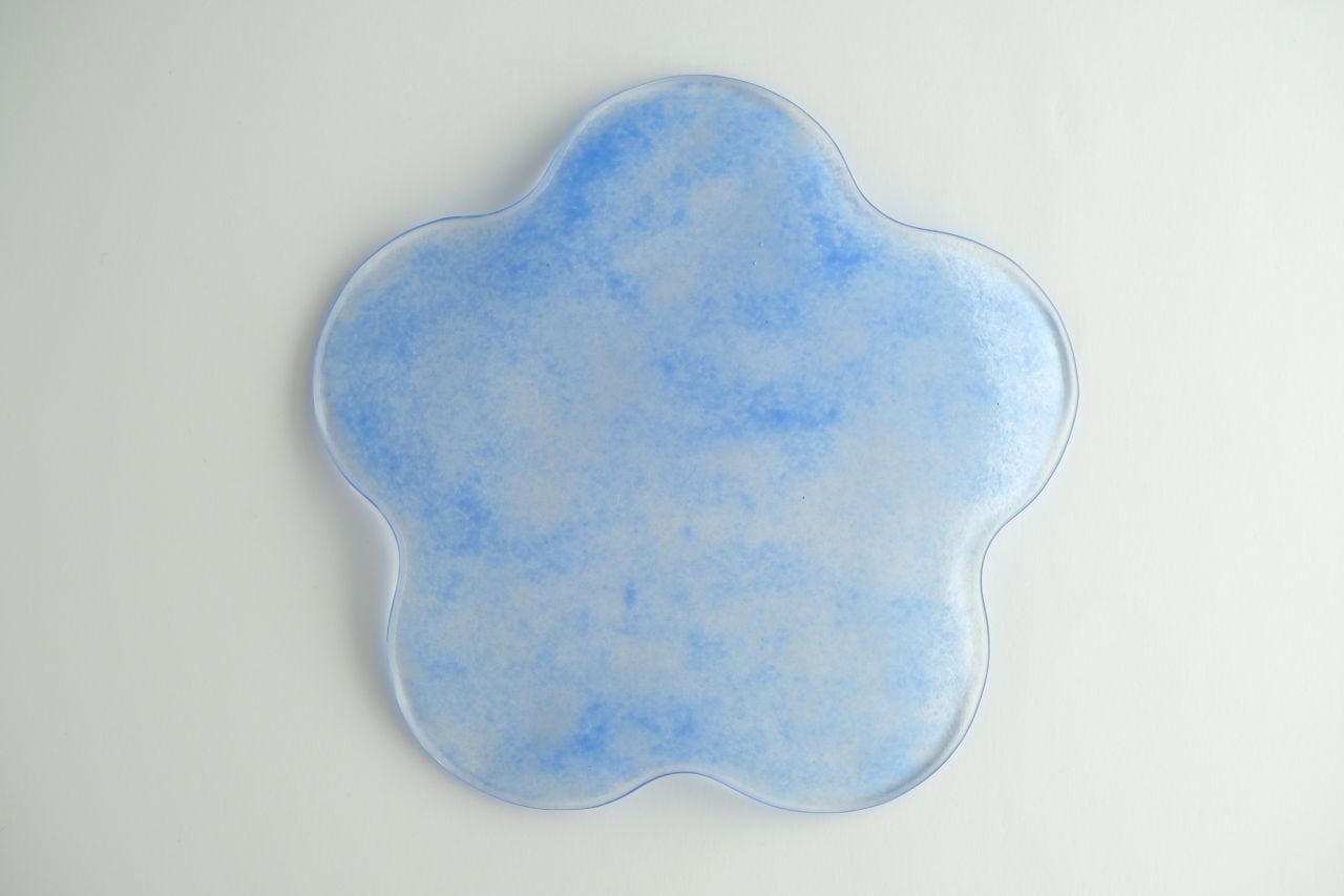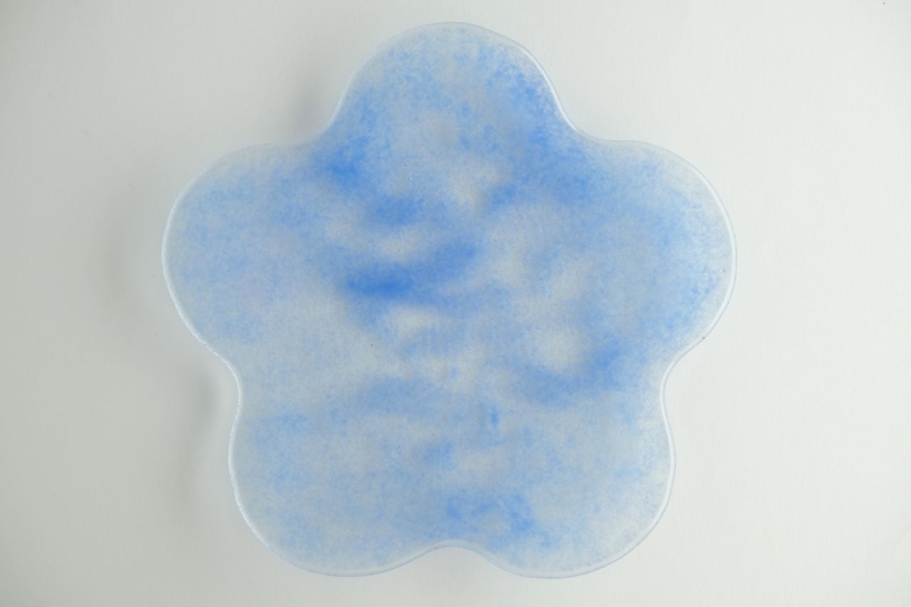 板ガラスにガラスの粉を焼き付けたものを、もう一度別の型に載せてお皿の形に曲げる、キルンワーク技法を用いています。