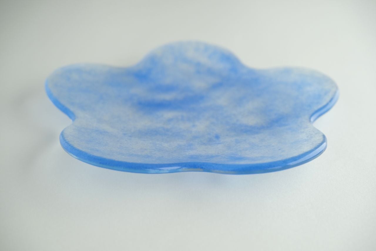 ふんわり立ち上がりのある、つややかな花の形のガラス皿です。