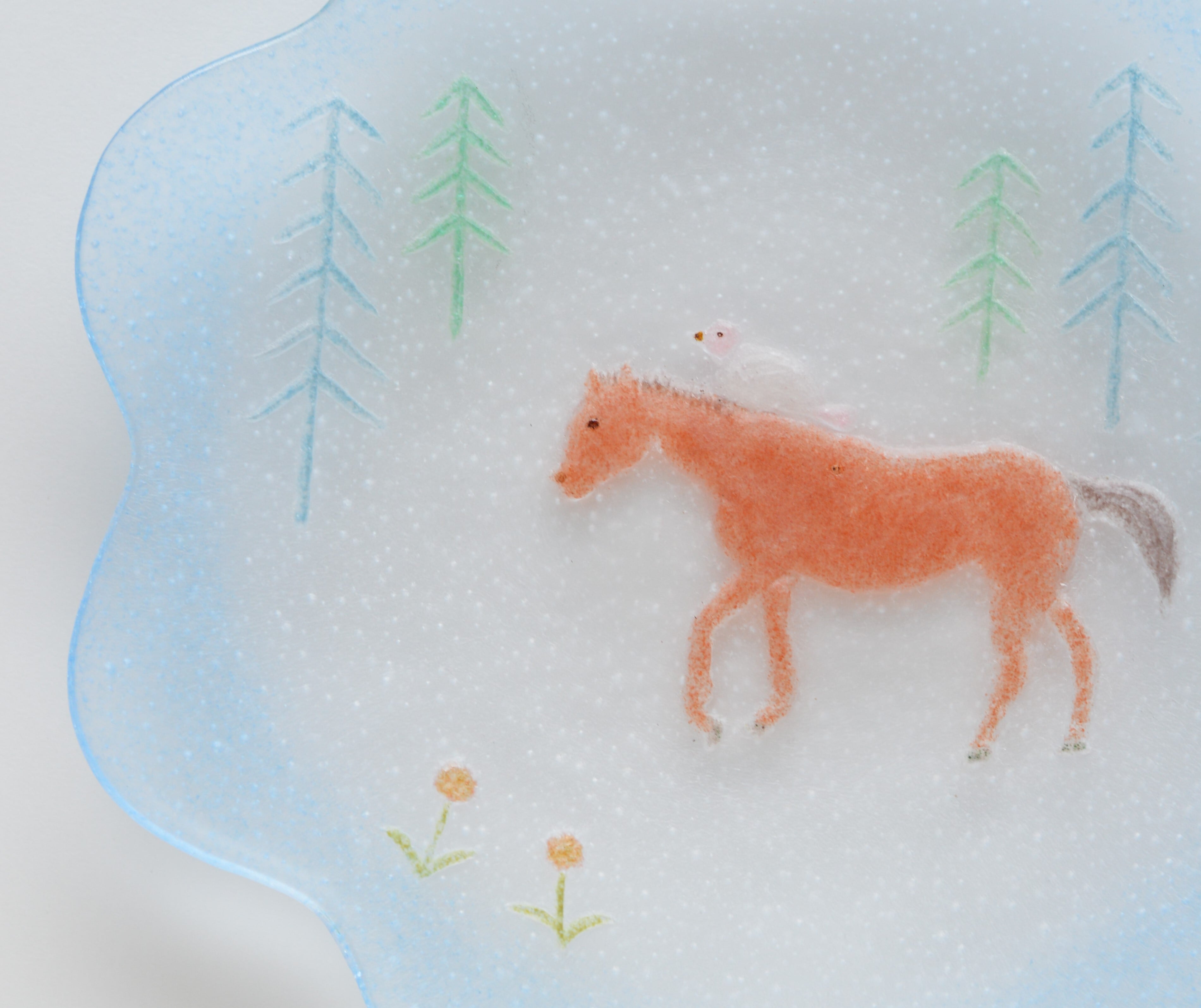 森の中を一頭の馬が歩いていたら、鳥がやってきて散歩の仲間に加わった。やがて夜が明けて…。そんなストーリーを想像して制作した、ガラスの絵皿です。
