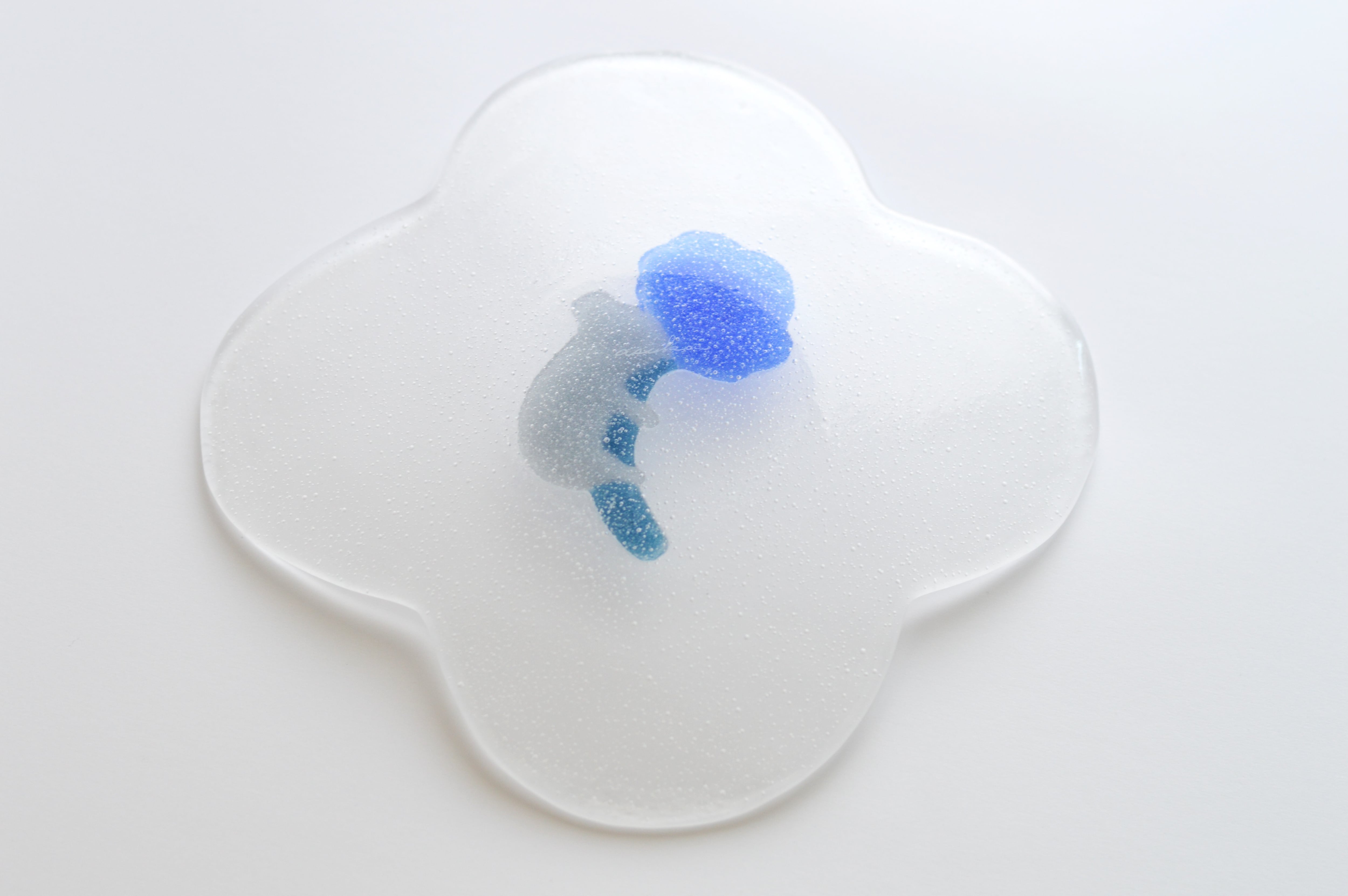 原型を耐火石膏で型取り、ガラスの粒を詰めて焼成し、板状に成形したものを、もう一度、別の型に載せて焼成し、お皿の形に曲げています。